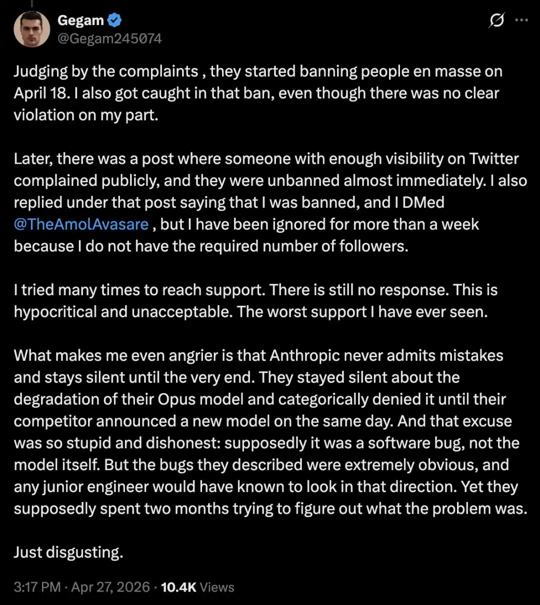模式已经相当清晰:Anthropic的自动化风控系统存在系统性的误杀问题,而它的客户支持体系,则完全跟不上误杀发生的规模和速度。