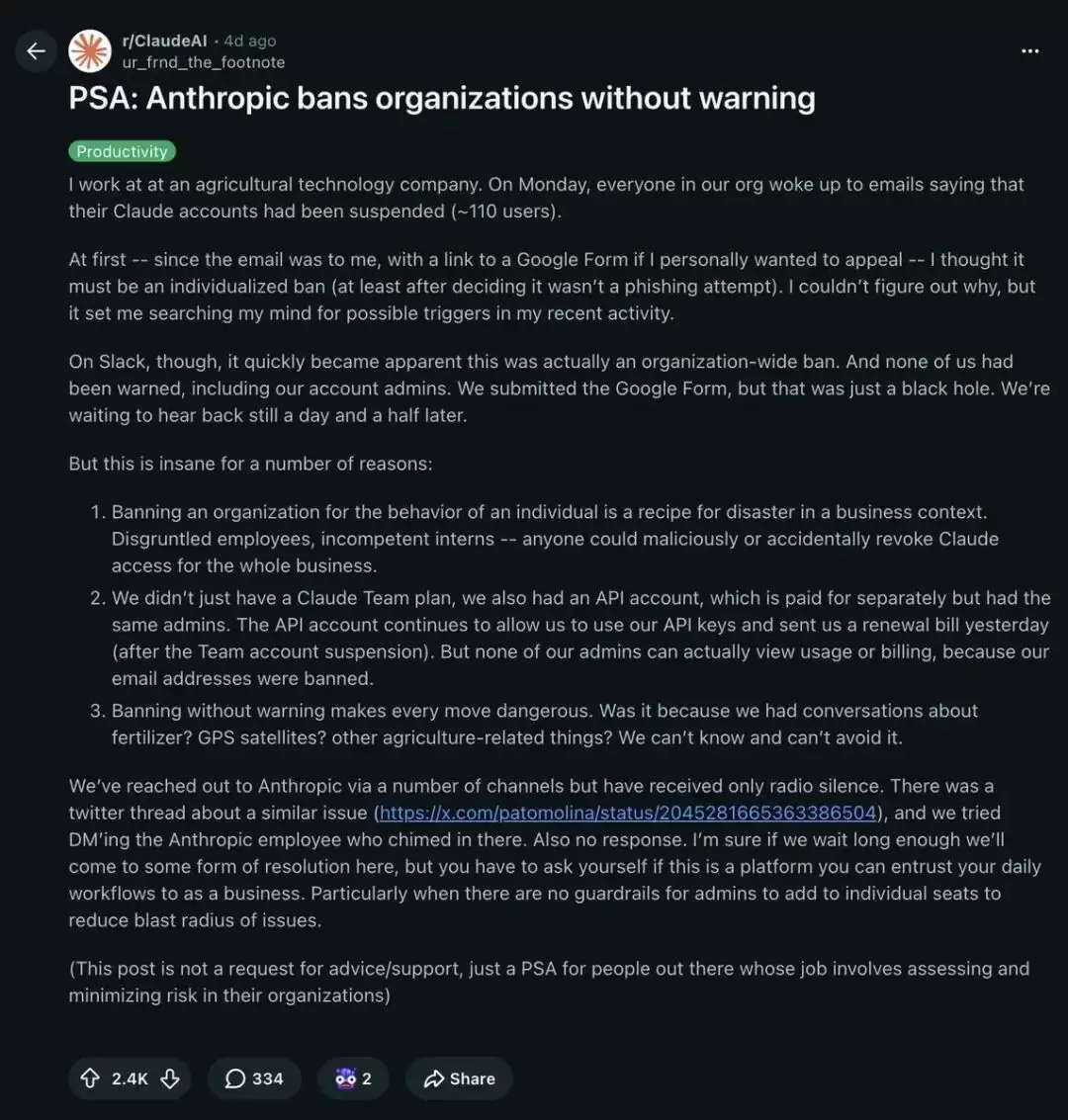 “Anthropic封了我们整个公司的账号,110个人,零预警。”