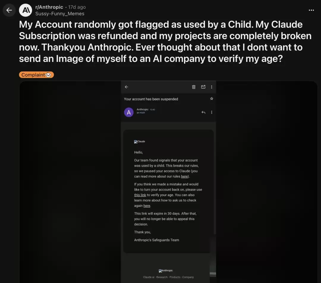 甚至有多名用户报告,自己的付费账号被错误标记为“未成年人”而遭到封禁。想象一下,一个成年人,支付着Pro版的费用,却被AI系统判定为小孩,然后一脚踢出门外。