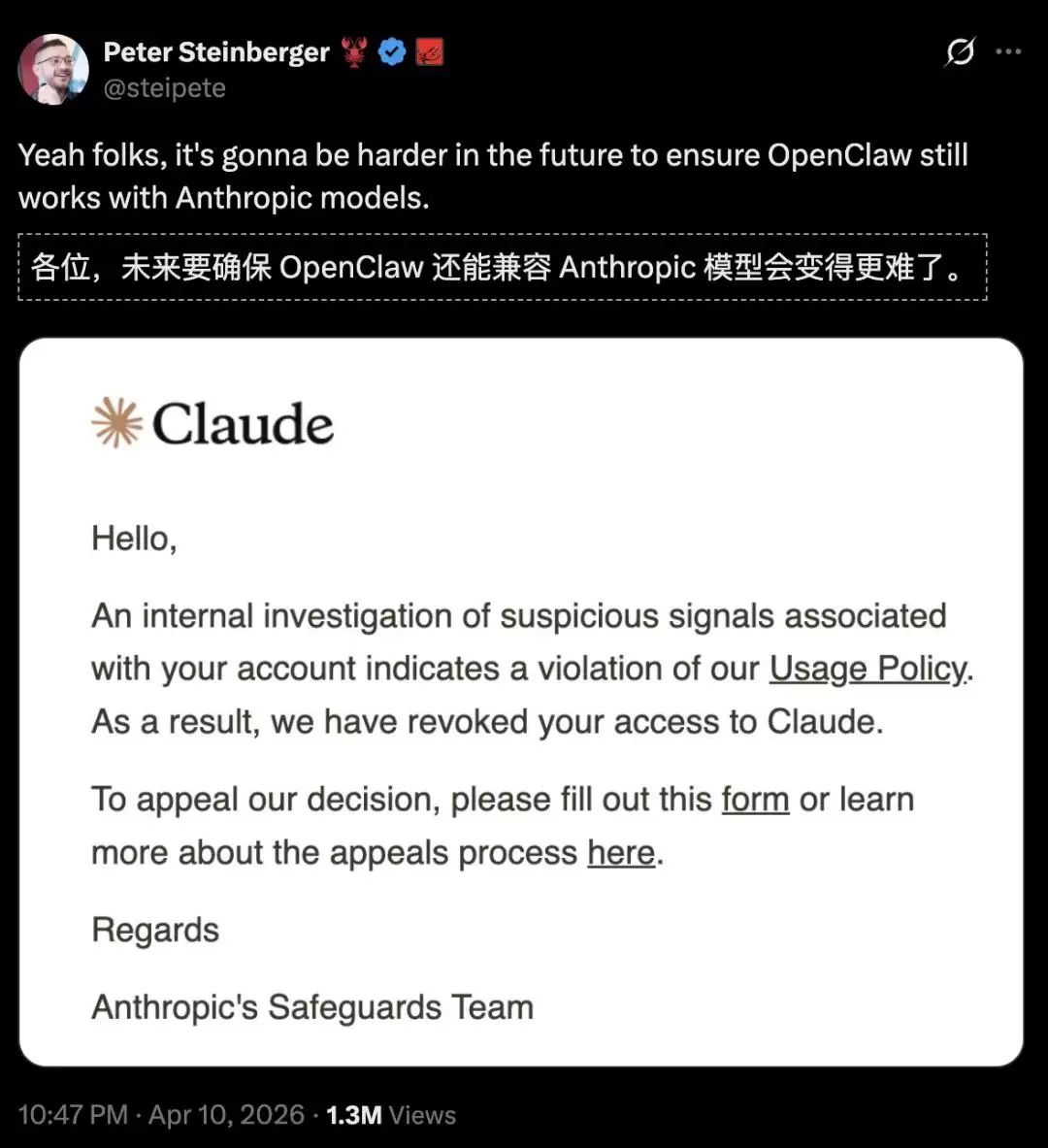 时间再往前推,OpenClaw创建者Peter Steinberger的Claude账号也曾被封,让人一度预测OpenClaw要兼容Anthropic模型的计划恐怕要悬了!