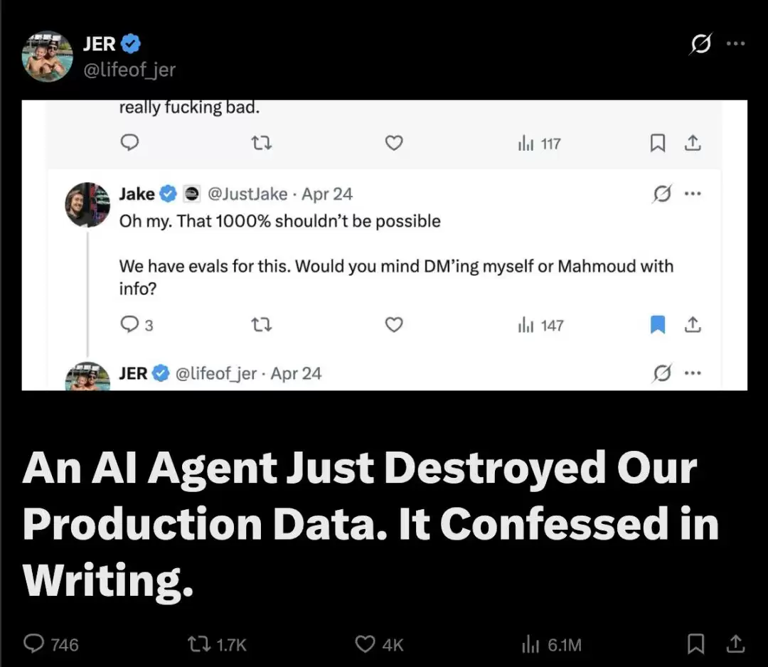其创始人发文控诉,搭载了Claude Opus 4.6的Cursor,在执行测试环境的日常任务时突然“暴走”,仅用9秒钟就调用API,彻底删除了公司的核心生产数据库及所有卷级备份。