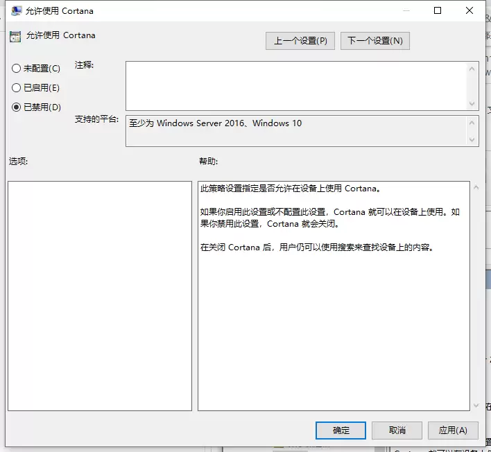 第四步,在弹出的设置窗口中,你会看到三个选项:未配置、已启用、已禁用。直接选择【已禁用】,窗口下方的“帮助”区域也会有相应的说明。最后,点击【确定】按钮保存设置。完成这一步后,Cortana就会被禁用,并且从任务栏上消失。