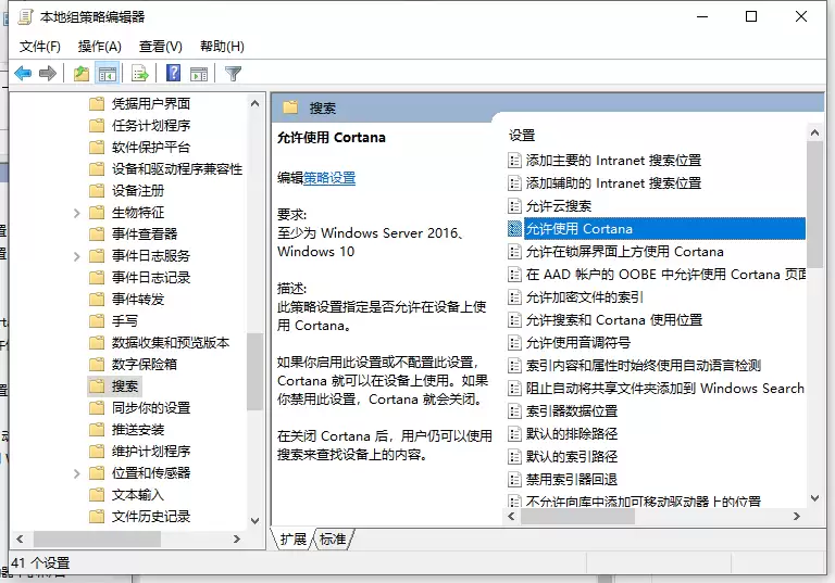 第三步,点击【搜索】后,右侧的主窗格会显示所有相关的策略设置。在其中找到名为【允许使用Cortana】的策略项,双击它进入配置界面。