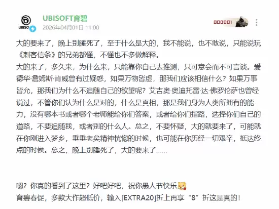 育碧愚人节整活:“大的要来了”,结果是促销码