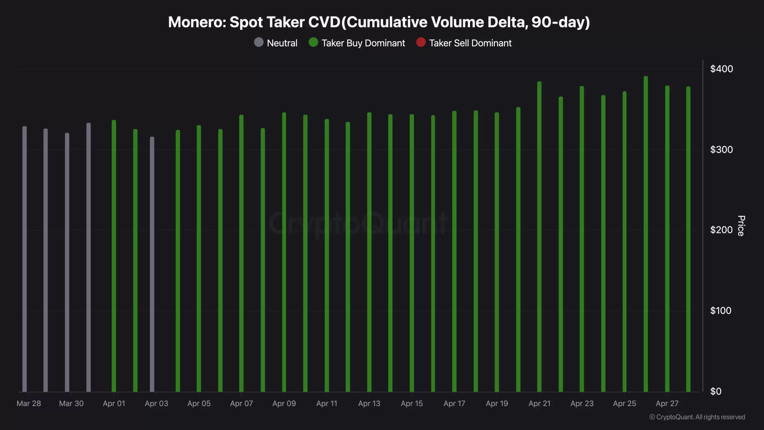 现货交易者的CVD图表讲述了一个持续买入的故事。从4月4日到4月27日,连续24个交易日都由买盘主导,卖盘几乎毫无还手之力。特别是在最后一周,当价格从355美元加速冲向405美元时,买入的柱状图显著放大。这说明现货买家不仅一直在场,而且随着价格上涨,他们的买入意愿和力度还在不断增强。