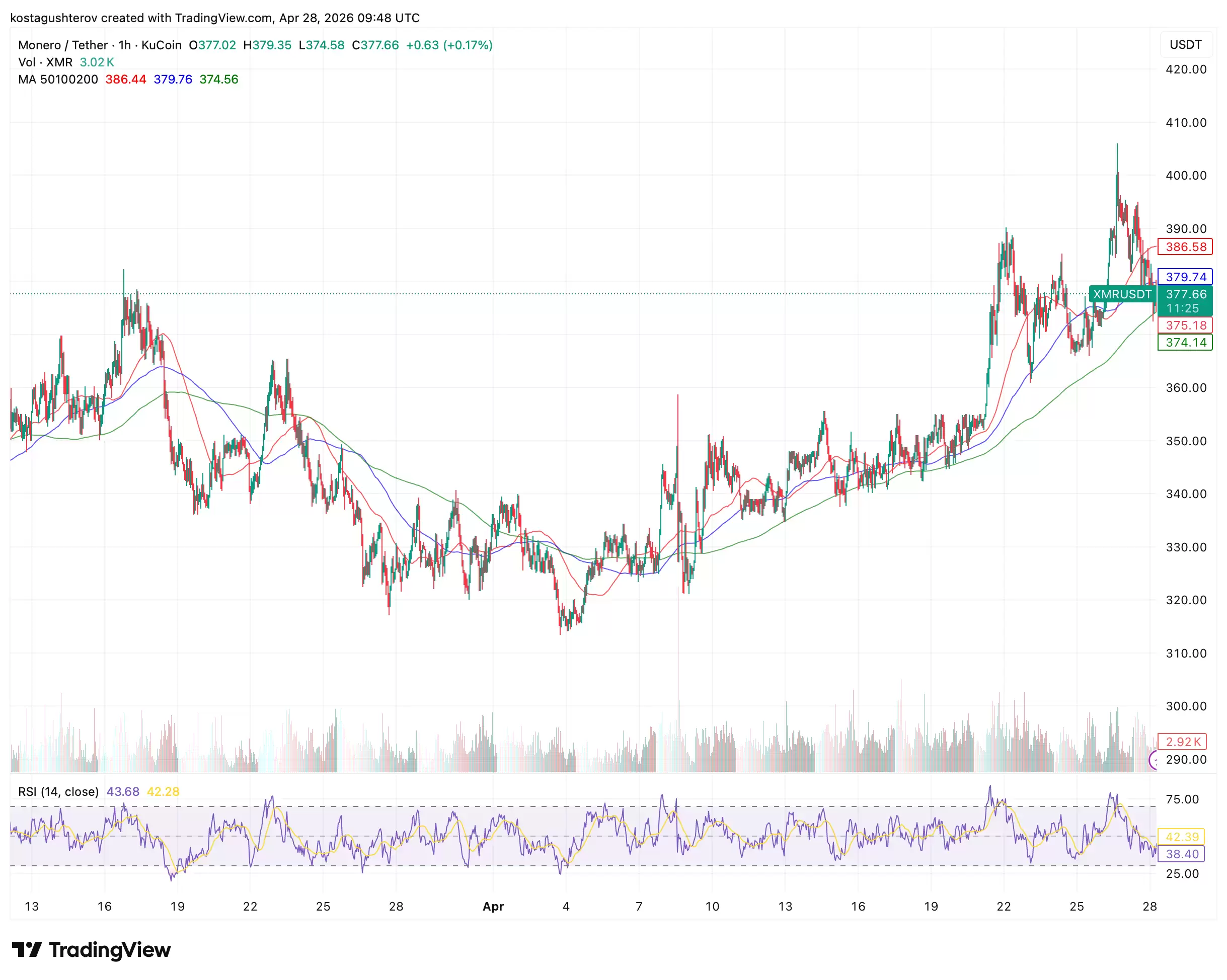 目前,XMR价格报377.66美元,正处于几个关键移动平均线构成的狭窄通道内交易,这为判断回调性质提供了线索。200日均线位于374.56美元,距离现价仅3.10美元;100日均线在379.76美元,距离2.10美元;50日均线则在386.44美元,距离8.78美元。这种格局意味着,回调仍在具有建设性意义的价位进行。简单来说,374.56美元的200日均线是当前的生命线,若跌破则当前结构失效;若能站稳并突破379.76美元的100日均线,则上涨结构有望恢复。