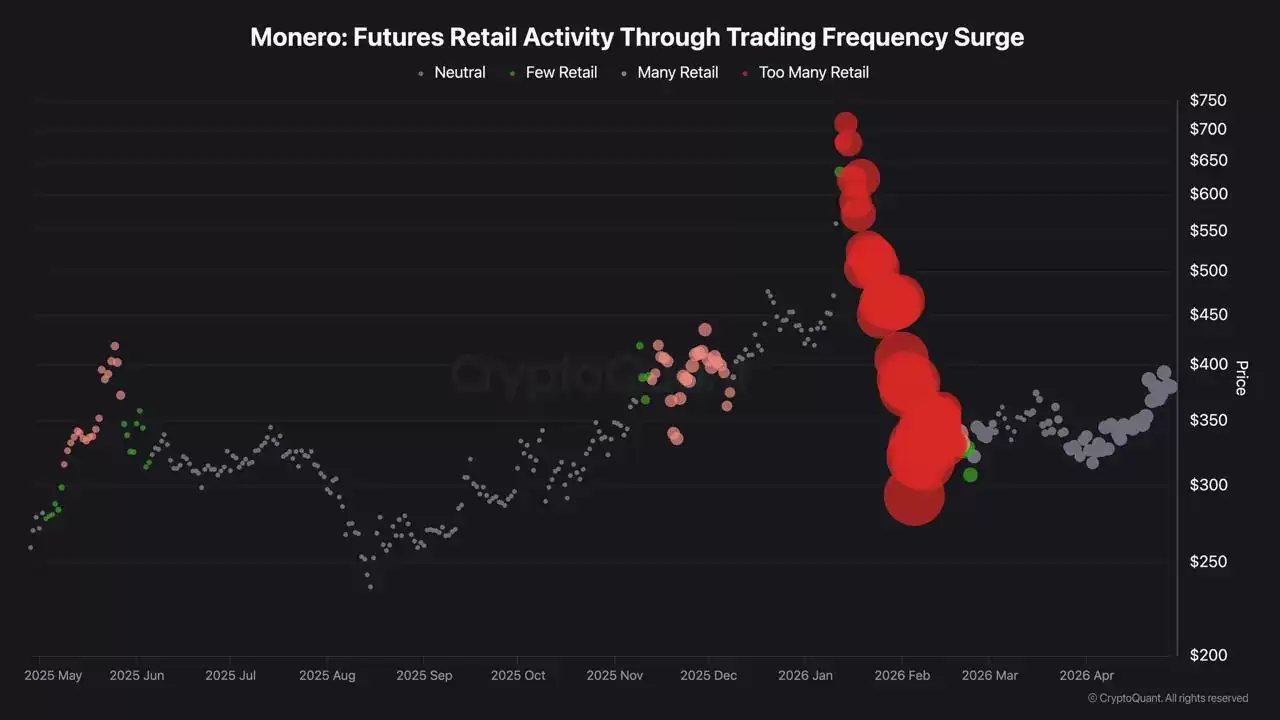 另一个更重要的风险潜伏在上方:高位套牢盘的抛压。所有在1月和2月于400美元至750美元区间买入XMR的投资者,目前仍处于浮亏状态。随着价格回升至400美元及以上,他们的亏损面将收窄,从而可能激发其在“接近成本价”时止损离场的意愿。由于这部分潜在的抛售尚未发生,因此在当前的CVD图表中无法体现。一旦价格重返400-450美元区域,它就将成为一个实实在在的结构性阻力。零售频率图表已经清晰地标明了这批套牢者的规模:那是过去12个月中“零售过量”读数最为集中的区域。