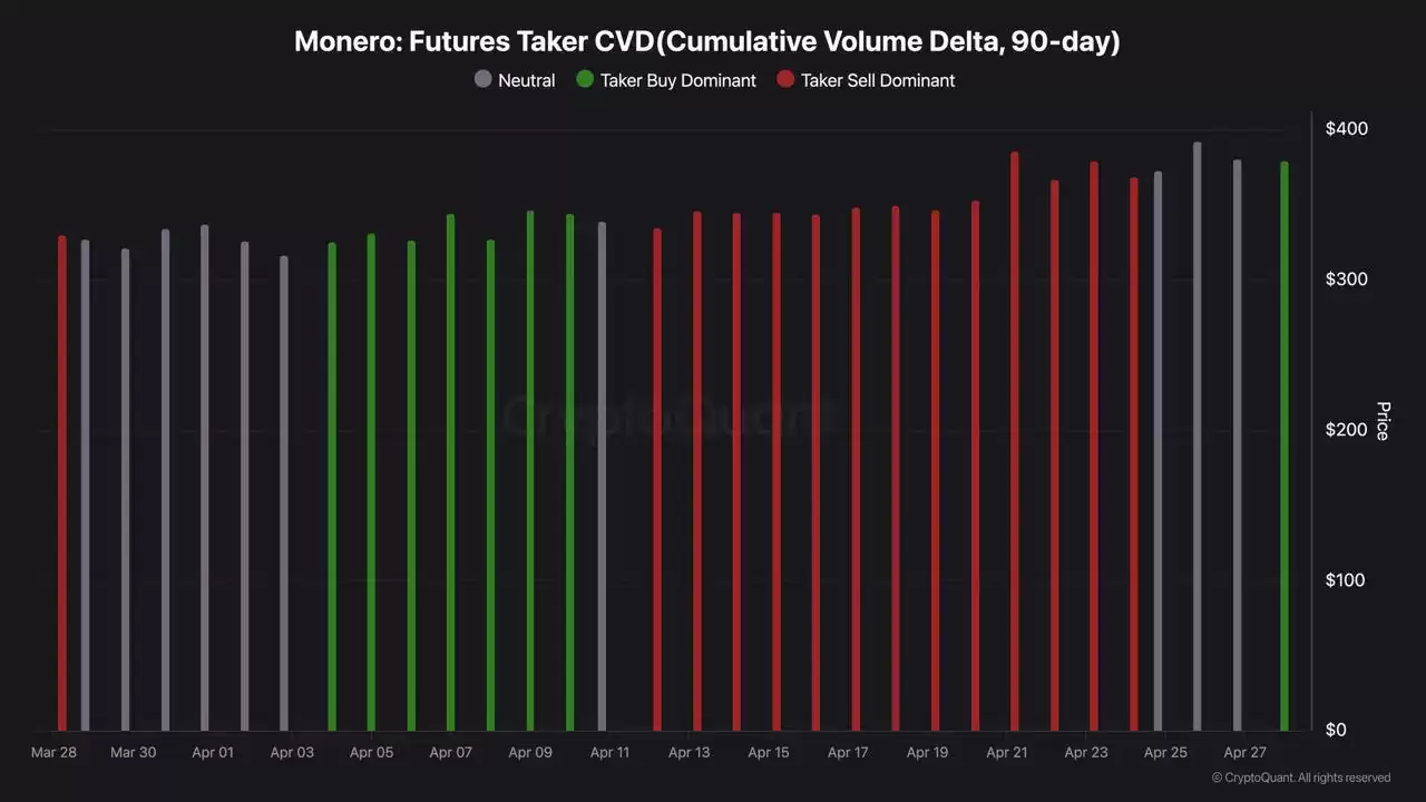 由全新散户资金涌入驱动的价格上涨往往比较脆弱,因为推动上涨的人往往也是下跌时最先逃跑的人。而四月份将XMR从320美元买至405美元的这批资金,情况则不同。他们完整经历了从750美元暴跌的全过程,并选择在底部区域买入。这代表了另一种类型的市场参与者——更有耐心的持有者。