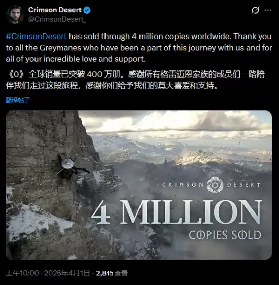 《红色沙漠》官宣销量破400万份!仅隔一周又卖100万份