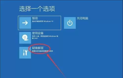 首先,你需要强行中断启动过程。长按电源键强制关闭电脑,如此重复操作2到3次。当系统多次启动失败后,会自动进入“高级启动选项”界面。在这个界面中,选择“疑难解答”。