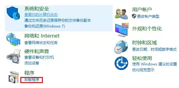 进入控制面板后,找到并点击“程序和功能”分类下的“卸载程序”。