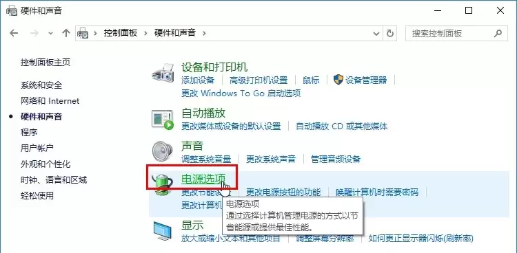 2. 来到“硬件和声音”设置页面后,下一步的目标就很明确了:找到并点击其中的“电源选项”。