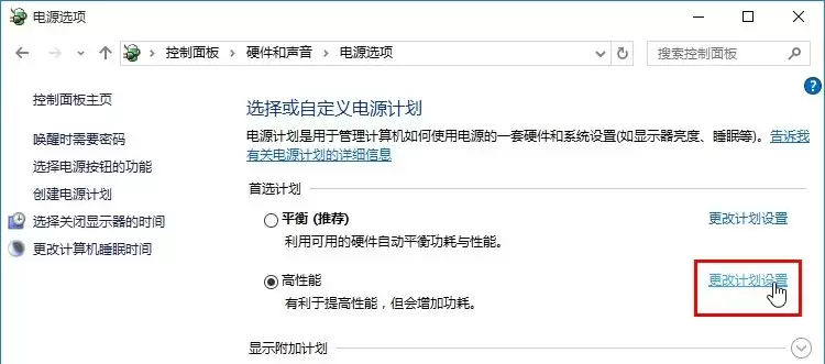 3. 紧接着,在电源选项设置界面,你会看到几个首选计划。这里需要点击“高性能”计划右侧的“更改计划设置”链接,具体位置可以参考下图。
