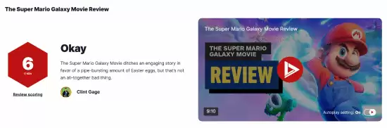 总评这样写道:我给《超级马里奥银河大电影》打6分。还行,真的就是还行。“还行”是我能想到的最贴切的词,既能形容这部电影的品质,也能概括我对他们所有创作选择的感受。如果你喜欢铺天盖地的梗和彩蛋,那你一定会爱上这部电影。从视觉上讲,它比第一部更大、更华丽。虽然它因为没有像前作那样打造一个强大的情感内核而失分,但《超级马里奥银河大电影》靠着塞满全片的彩蛋赚回了几条命。在大银幕上看到那些熟悉的元素确实很有趣,但如果没有一个能与之相配、能引起共鸣的故事支撑,它的效果终究没能达到它本该有的高度。