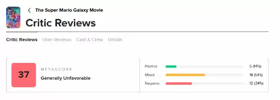 《超级马里奥银河大电影》口碑深度解析:为何媒体与观众评分两极分化? 自《超级马里奥银河大电影》全球公映以来,其口碑评价呈现出极为鲜明的两极分化态势,引发了业界与影迷的广泛讨论。 在汇集了众多专业影评的Metacritic平台上,影片的媒体综评得分仅为37分(满分100),这一分数表明其并未获得主流影