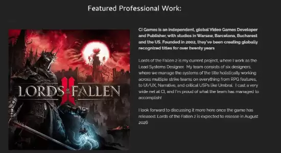 最近游戏圈里传开了一个热乎消息:《堕落之主2》的发售窗口可能被“不小心”提前公布了。说起来,这事儿还挺有戏剧性——消息源头并非官方公告,而是出自游戏主系统设计师Dan Regan的个人简历。在那份简历里,他一度明确将游戏的发售日期标注为2026年8月。虽然相关信息随后被火速删除,但手快的社区玩家早已截图保存,这张“证据”也随之在网络上流传开来。