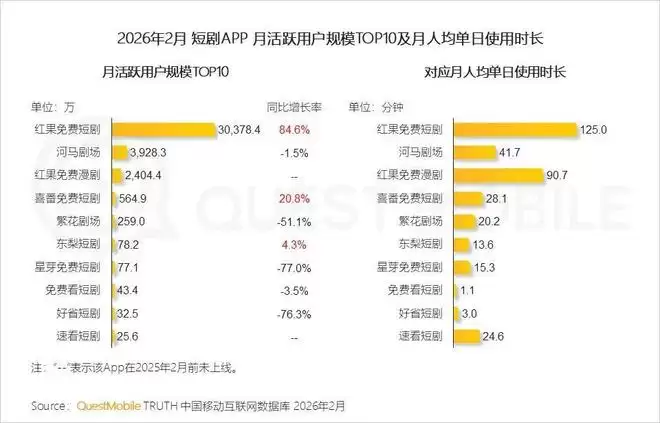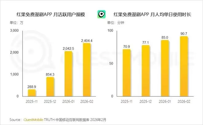 免费漫剧与短剧赛道深度解析:用户规模与使用时长双双攀升 最新行业数据揭示了数字内容消费市场的关键动向。根据QuestMobile于2026年2月发布的统计报告,免费漫剧和短剧赛道正呈现出强劲的用户粘性与显著的增长势头,成为当下最受关注的内容领域之一。 以红果免费漫剧APP为例,其市场表现尤为突出。数