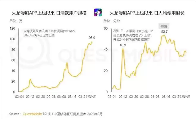 市场的热度也吸引了新的竞争者入局。例如新上线的火龙漫剧APP,自2月4日上线以来增长迅速,其日活跃用户规模在3月31日达到了95.9万的峰值。同时,用户人均单日使用时长最高也达到了53.7分钟。作为赛道新玩家,能在短期内获取近百万日活并维持超过50分钟的用户时长,充分说明其初期的内容策略与市场定位精准地契合了当前用户的消费需求。