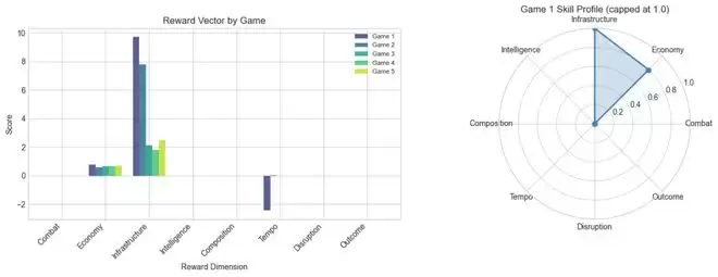 而且,它暴露得极为精确。如果只看胜负,5局平局一语便可概括。但8维奖励向量却清晰地指出:经济得分0.58-0.80,基建尚可,战斗与骚扰为零。弱点在哪里,后续的课程学习该从何处着手,一目了然。