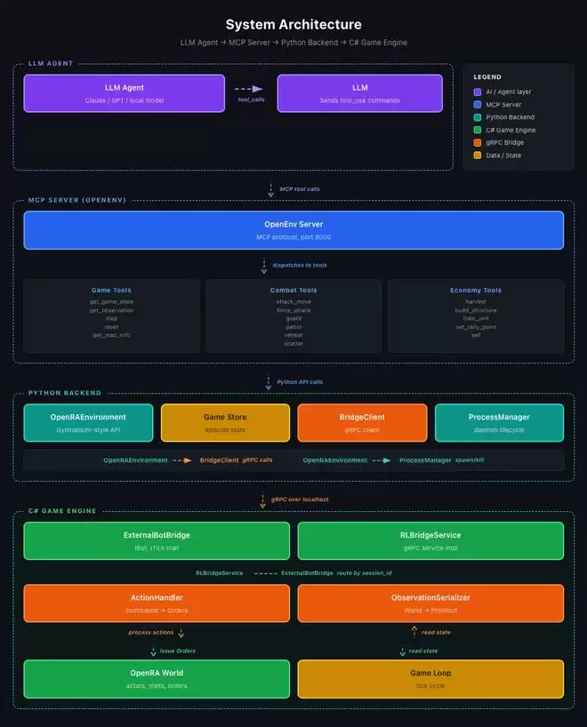 OpenRA-RL的架构可以形象地理解为“三层三明治”: