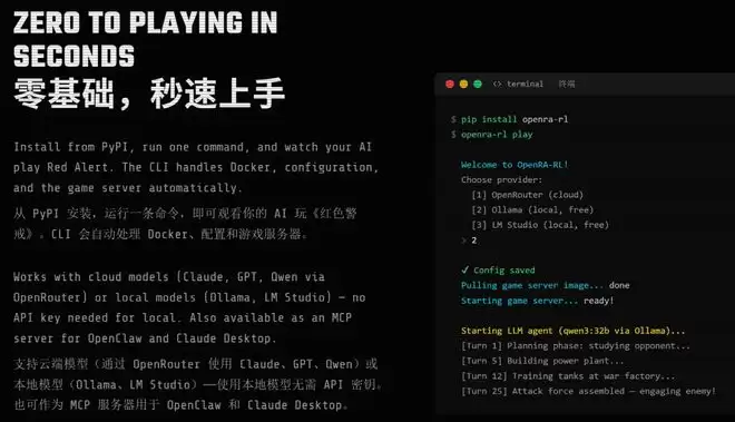 而现在,开源社区第一次将RTS智能体训练的门槛踏平了。只需要一台消费级显卡,执行一行pip install openra-rl命令,任何研究者都能站上同一条起跑线。