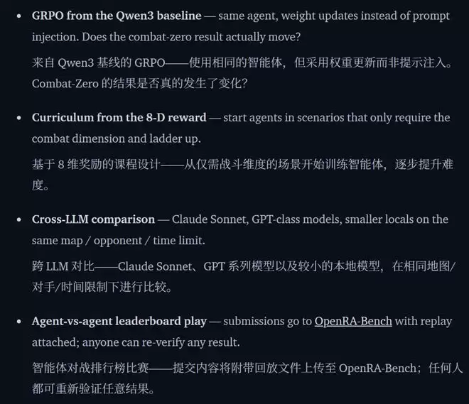 团队在博客中列出了明确的下一步方向:基于Qwen3基线运行GRPO(用权重更新替代提示注入,观察战斗零分能否被突破);利用8维奖励设计课程(从仅需战斗的场景开始,逐步增加复杂度);进行跨模型横向评测(让Claude Sonnet、GPT级别模型、更小的本地模型在同一地图、同一对手、同一时间限制下竞技);以及建立智能体对智能体的排行榜。