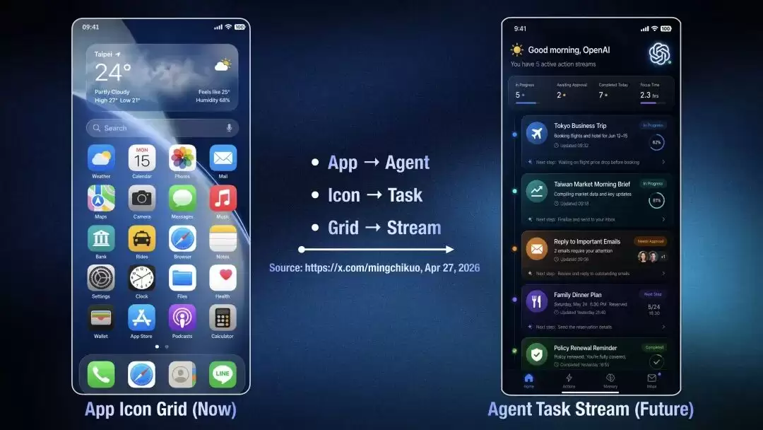 在郭明錤的设想图中我们可以看到,在AI Agent的操作逻辑中,原本熟悉的「桌面 - App」模式会被一种「Agent任务流」所取代——