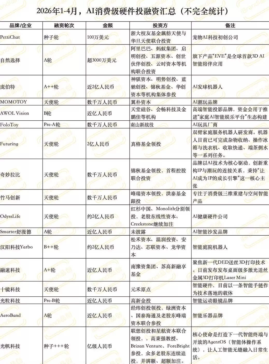 更快地获取信息,更高效地完成任务,更精准地解决问题——很长一段时间里,这几乎构成了AI产品最主流的价值叙事。与此同时,AI在消费市场也迅速升温,变得越来越热门,也越来越吸金。据iBrandi品创不完全统计,截至4月底,2026年共披露17起AI消费级硬件融资,金额超过19亿元rmb。