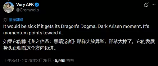 更有意思的是,Douse还特别提到了《红色沙漠》发售后那趟过山车般的口碑旅程:先跌入谷底,随后又凭借后续更新与内容调整,逐步回暖。对于这个现象,他给出了一个充满潜力的展望:“如果它能迎来属于自己的《龙之信条:黑暗觉者》那种‘翻身时刻’,那会很酷。从目前来看,它是有这个势头的。”