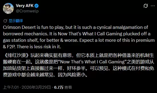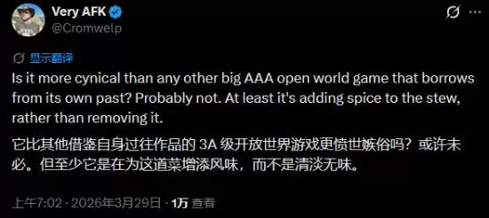 话又说回来,这种“加法”设计真的比其他游戏更“投机”吗?Douse自己也打了个问号。他补充道:“它真的比那些同样不断复用自身玩法的3A开放世界游戏更‘投机’吗?可能也未必。”至少,相比起某些不断“缩水”或内容贫瘠的作品,《红色沙漠》是在努力地“往锅里加料,而不是减料”。这种态度,本身就值得拿出来讨论一番。