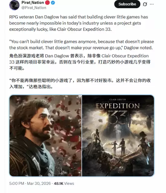 资深从业者深度剖析:精品独立游戏的成功是实力还是运气? 近日,游戏行业资深人士丹・达格洛发表了一番引发广泛讨论的观点。他指出,在当前的市场环境下,想要精心打造并成功推出一款高质量的独立游戏或小型作品,正变得前所未有的艰难,除非团队能获得“天时地利”般的机遇。他特别提到了《光与影:33号远征队》,并将
