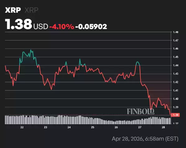 具体来看,过去七天里,XRP的价格下跌了4.10%。截至4月28日,其交易价格徘徊在1.38美元附近。价格下滑的直接影响,就是市值的显著缩水——短短一周内蒸发了约33.4亿美元,总市值下跌3.78%,目前大约在851亿美元左右。这组数据清晰地勾勒出市场当前的谨慎态度。