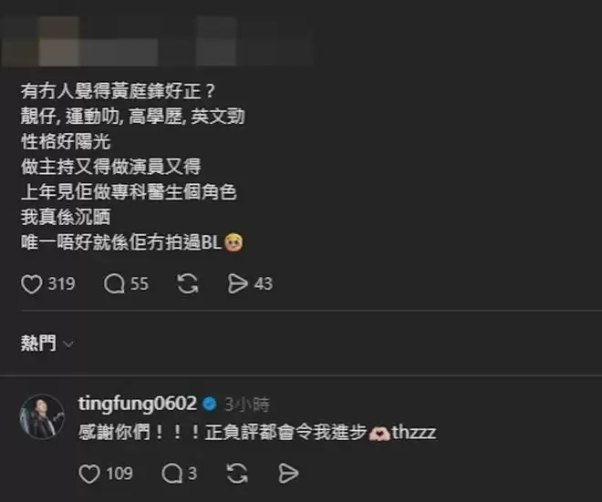 有趣的是,這場討論意外引來黃庭鋒本人親自回覆。他寫道:「感謝你們!!!無論正面或負面評價都會讓我進步,thzzz。」回應展現出其謙遜與積極的陽光態度。綜觀而言,黃庭鋒在外形、學歷、語言能力及演技方面均頗具實力,整體條件出色。但為何始終距離「一線爆紅」差臨門一腳?這或許是留給觀眾與娛樂行業思考的一個話題。