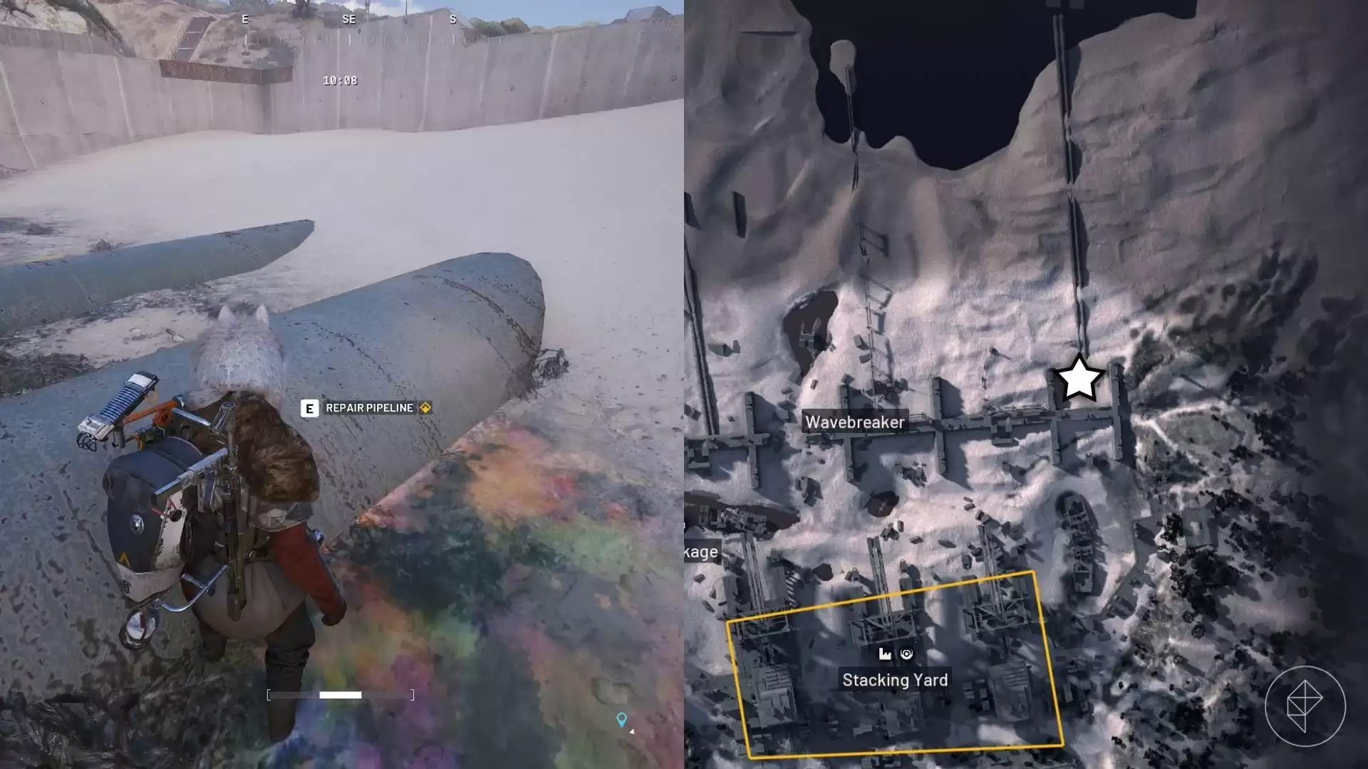 图示:Ford James/Polygon | 图片来源:Embark Studios via Polygon最后一个目标位于海滩的另一端,其实离你拍摄裂缝的地方并不远。从“Wa vebreaker”出发,一直往最东边走,你会看到两条巨大的管道从海中延伸出来。找到这些管道的最南端(那里几乎紧挨着海堤),就能在带有经典彩色浮油效果的水域旁,对其中一条管道进行修复了。