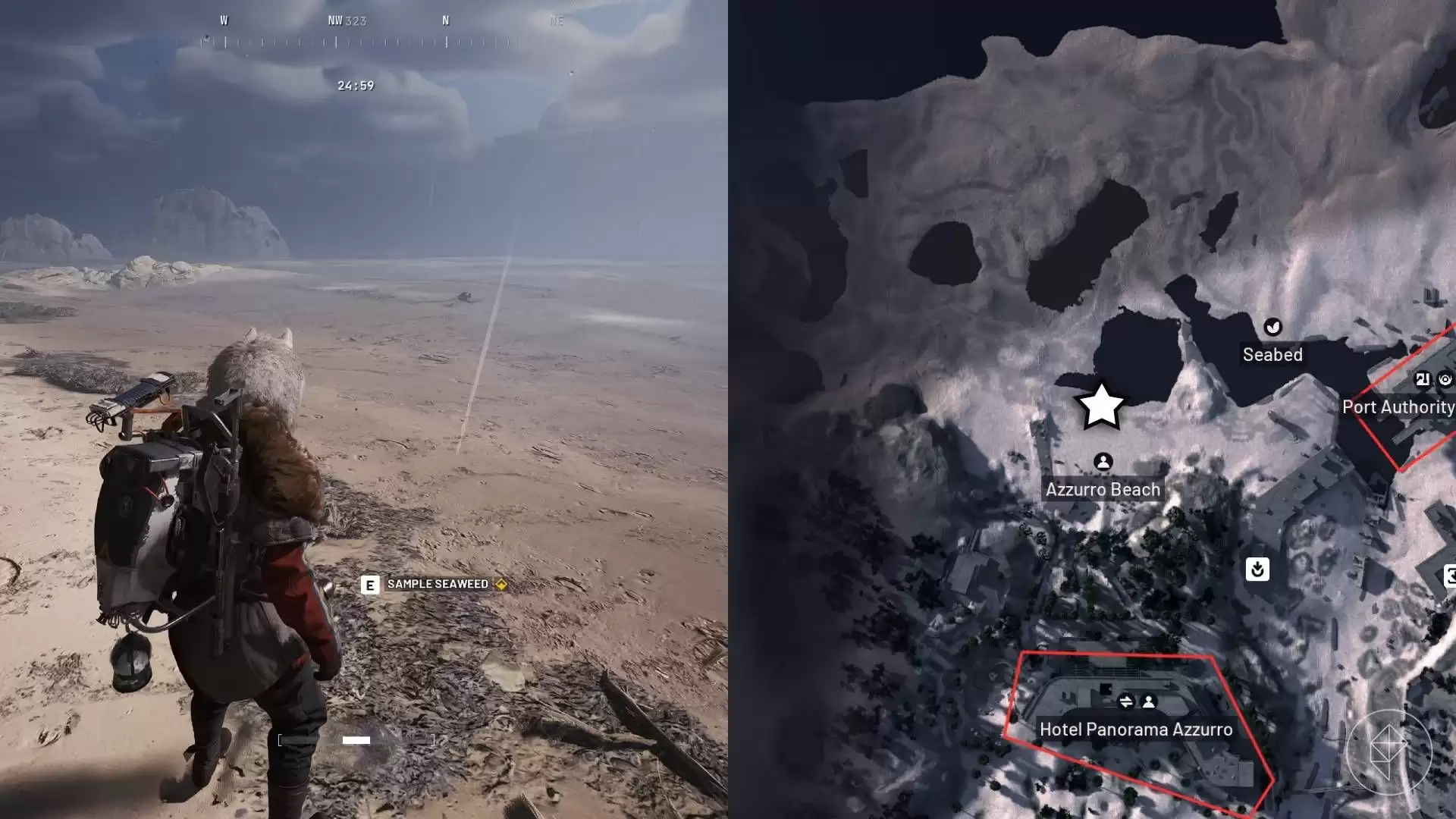 图示:Ford James/Polygon | 图片来源:Embark Studios via Polygon这个目标点位于地图的西北角,也就是“Azzurro Beach”区域。你需要径直朝地图上该地标文字的正北方、“Seabed”的西南方前进。到达海水与沙滩的交界处后,留心观察,可以在那里找到可供采样的海草。