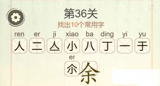 《聪明开局吧》第36关:从“余”字中找出10个常用字 《聪明开局吧》的第36关,目标是从一个“余”字里,拆解出10个常用汉字。最终的答案是:人、二、亼、小、八、丁、一、于、尒、余。听起来有点复杂?其实只要掌握从简到繁、从分到合的拆解顺序,一步步来,通关并不难。 >>>《聪明开局吧》全关卡通关攻略大全