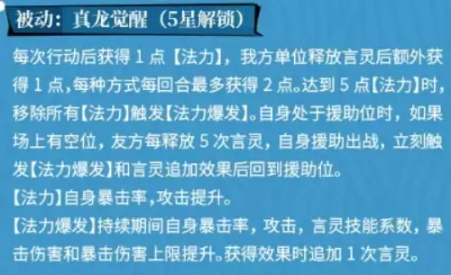 五星被动“真龙觉醒”,是傲烈机制中最复杂也最精彩的部分,彻底释放了他的爆发潜力。傲烈每次行动结束后,会为自己积累1点“法力”。此外,己方其他单位每次释放言灵,也会额外为他增加1点“法力”(每种方式每回合最多各加2点)。当“法力”积攒到5点时,会全部清空,并触发强大的“法力爆发”状态。在此期间,傲烈的暴击率、攻击力、言灵技能系数、暴击伤害乃至暴击伤害上限都会获得全面提升,并且还会追加一次言灵攻击。值得注意的是,“法力”值本身也提供增益,会随点数提升暴击率和攻击力。也就是说,傲烈在积攒“法力”的过程中就已经在逐步变强,并非要等到5点满额才启动,这个设计让他的成长曲线非常平滑。