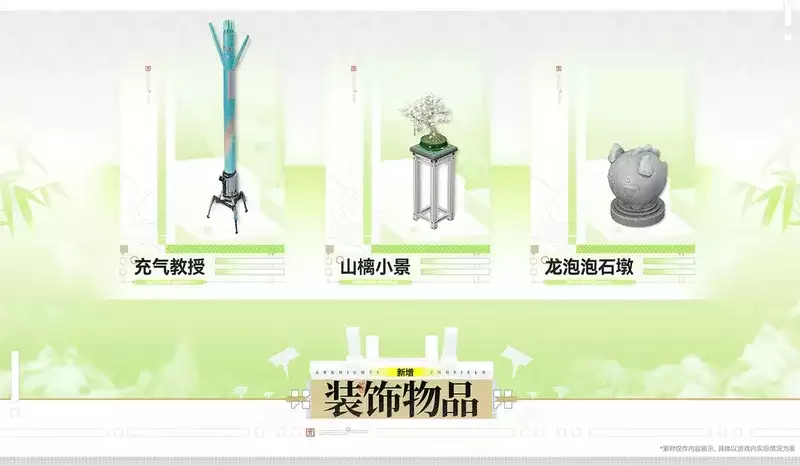 基地的个性化装饰库也上新了。这次新增了三种趣味十足的装饰物品:“充气教授”、“龙泡炮石墩子”以及“山樆小景”。其中,“山樆小景”可以免费获取,而“充气教授”和“龙泡炮石墩子”则需要使用调度券进行购买。这些新物件为玩家提供了更丰富的选择,方便大家自由搭配,打造独一无二的拍照构图。