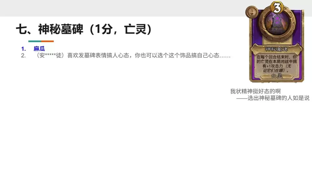 首先,最直接的用法,就是给那些高费用的核心随从戴上。比如你在中期拿到了一个关键的五费或六费核心。给它挂上墓碑,就等于给它加了一道“死后贡献”的保障。即便它被对手先手解掉,也能在离场时为你创造可观的场面价值或资源补充,不至于让投资完全打水漂。这种用法求稳,能有效降低“血本无归”的风险。