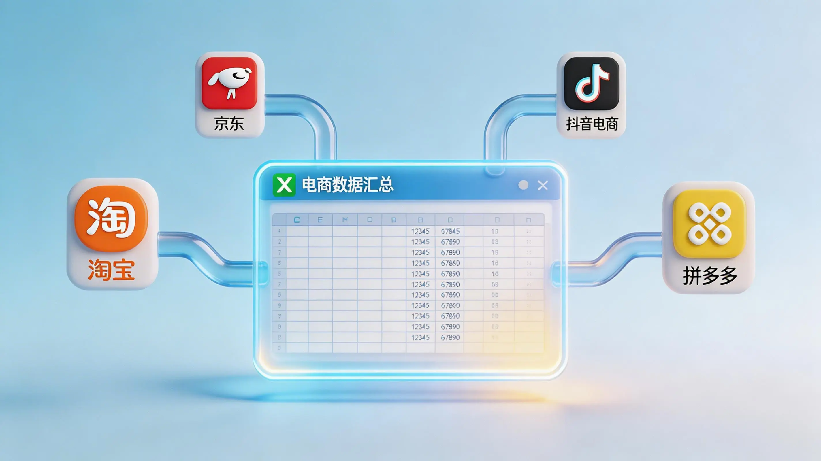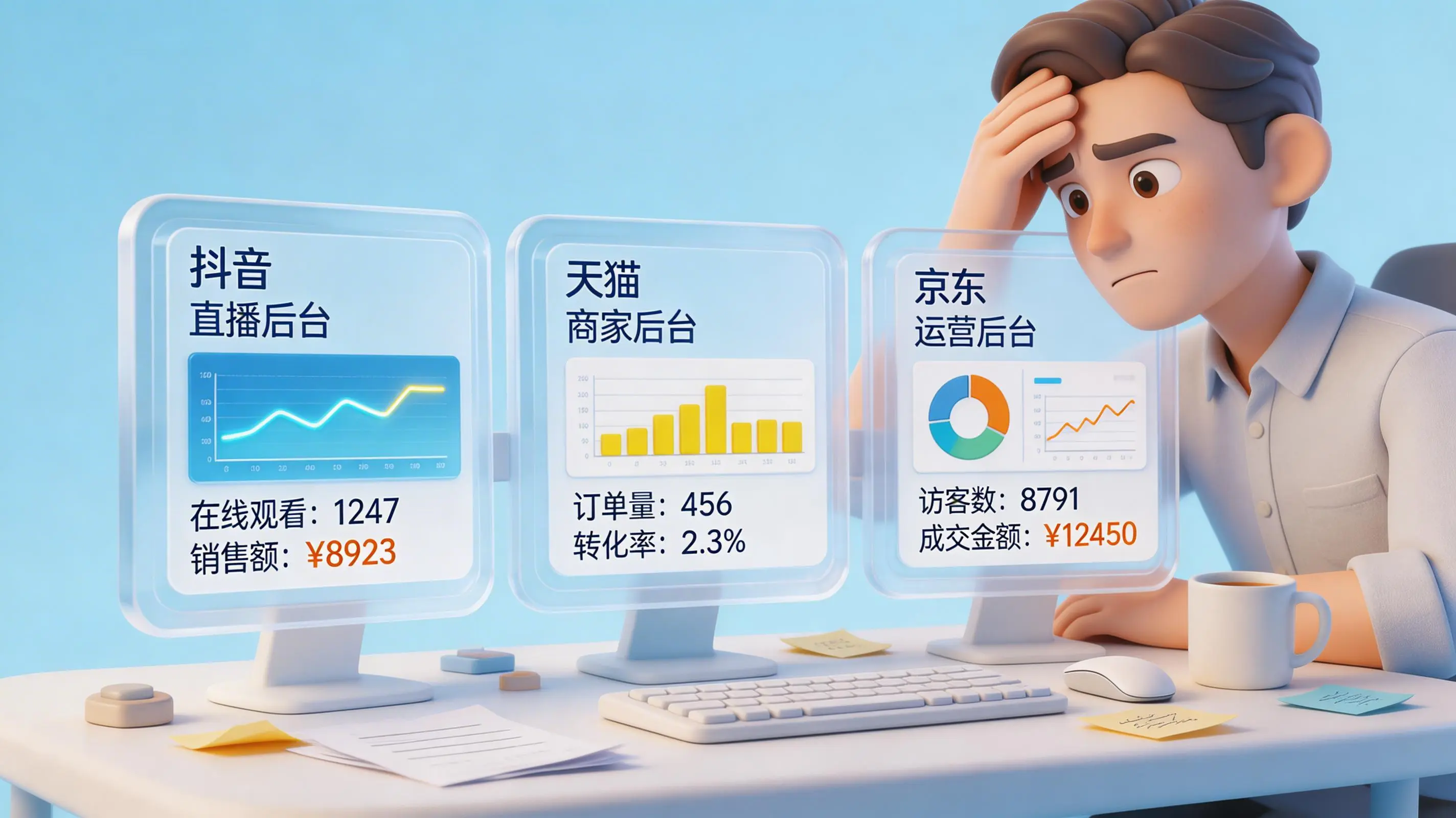 第一关,多平台数据孤岛。 运营人员的一天,常常始于在各个后台间频繁切换:淘宝天猫、京东、抖音小店、拼多多……重复执行登录、筛选日期、导出CSV这一套标准动作。光是“找数据”这一步,就已耗费大量心力。