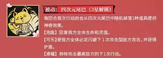 当九月升至三星,解锁被动“四次元尾巴”后,她的战术灵活性将获得质的飞跃。该技能效果是:每回合首次行动后,随机掉落一种道具。这三种道具各有妙用:“泡面”能回复全体生命与灵值,缓解治疗压力;“可乐”则让我方全体获得一次攻击必定闪避效果及护盾,堪称应对敌方关键大招的“救命稻草”;而“滑稽”则能直接移除攻击最高敌人的下一次行动,打乱对手节奏。尽管效果随机,但每一种都可能成为破局的关键,让九月在战场上充满了不可预测的辅助价值。