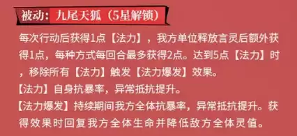 五星解锁的第二个被动“九尾天狐”,则进一步深化了九月的后期能力。其核心在于“法力”的积累机制:九月每次行动后获得1点法力,我方单位释放言灵技能时她可额外获得1点(每种方式每回合上限2点)。当法力积攒至5点时,将触发“法力爆发”并清空。在积攒过程中,九月自身的抗暴率与异常抵抗会随法力点数提升而显著增强。这意味着,战局越往后,九月自身也越难以被暴击或控制,保证了其辅助效果的稳定持续。