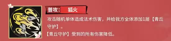 先从基础攻击说起。九月的普攻“狐火”,其直接伤害或许并不亮眼,但真正的价值在于后续效果——它能为我方全体附加一层“青丘守护”,提供可观的伤害减免。单层效果或许温和,但这个减伤效果是可以叠加的。这意味着,在持久战或高压关卡中,通过多次普攻累积起的减伤层数,能显著提升整个队伍的生存韧性,为输出角色创造更安全的发挥空间。