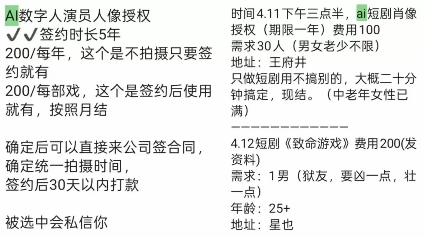 曾在长沙和横店跑过群演的@不想上班 观察到,今年4月份,她所在的演员通告群里开始频繁出现短剧公司收购AI肖像的信息。在社交媒体上搜索「人像授权」,也能看到大量短剧公司发布的招募帖。
