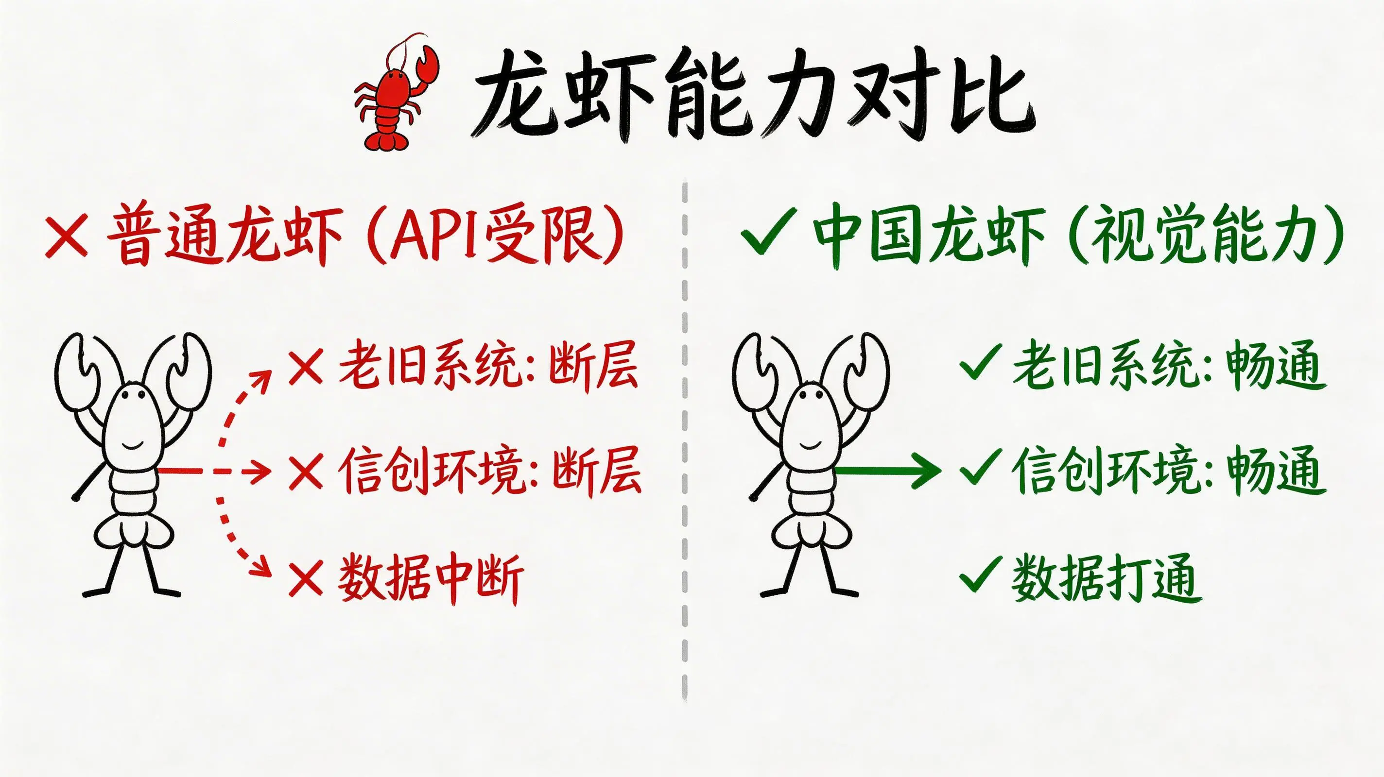 普通智能体有个通病,可以称之为“API依赖症”。一旦面对那些没有开放接口、无法通过代码直接调用的老旧ERP系统、内部OA,或是管控严格的信创环境,它们往往就“束手无策”了。这恰恰是目前企业AI落地过程中,最现实也最难跨越的一道“能力边界”。