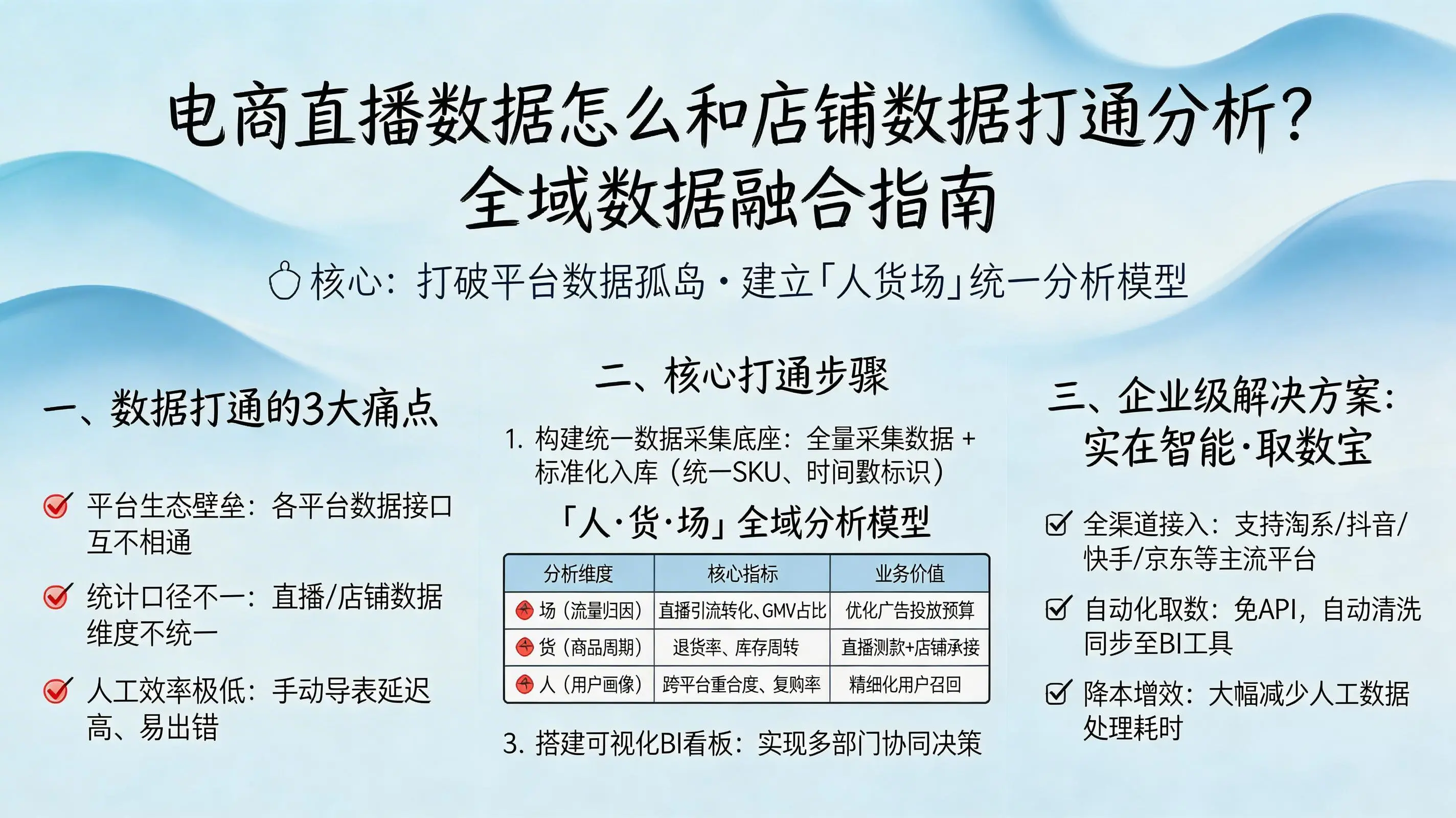 对于今天的电商企业而言,一个最核心的增长命题摆在面前:如何将火爆的直播间数据,与你苦心经营的货架店铺数据融为一体,进行真正打通和深度分析?这早已不是技术探讨,而是决定全域GMV增长的实际经营挑战。