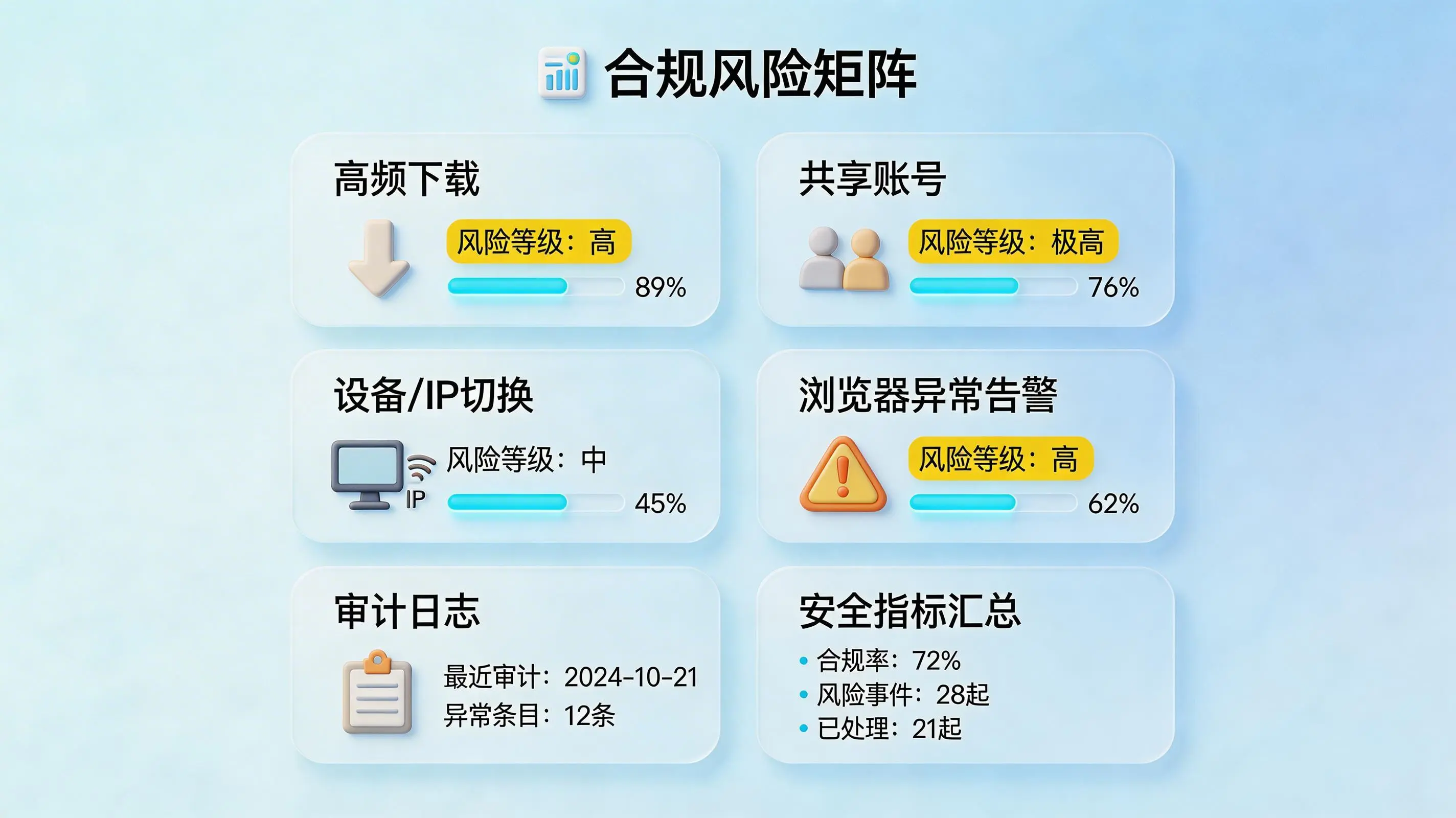 - 异常登录环境:同一账号在短时间内于多个城市、多台设备、多种浏览器环境之间快速切换。