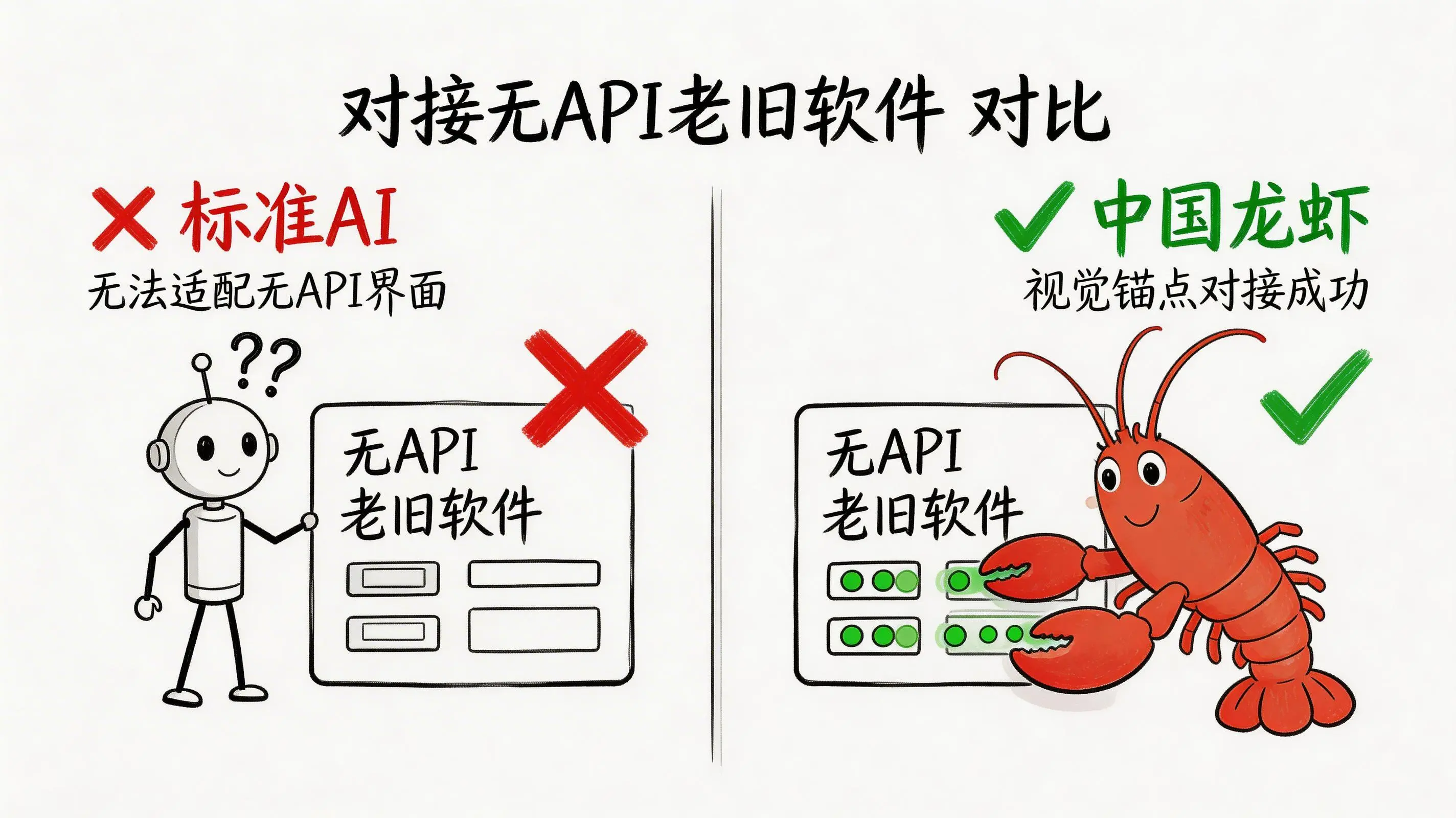首先是无API困境。许多企业内部的老旧系统,比如早期的ERP、自研的OA甚至是政务专网里的应用,根本没有对外提供标准接口。这让依赖API沟通的普通“龙虾”只能望而兴叹,空有智能却无法触及核心业务。