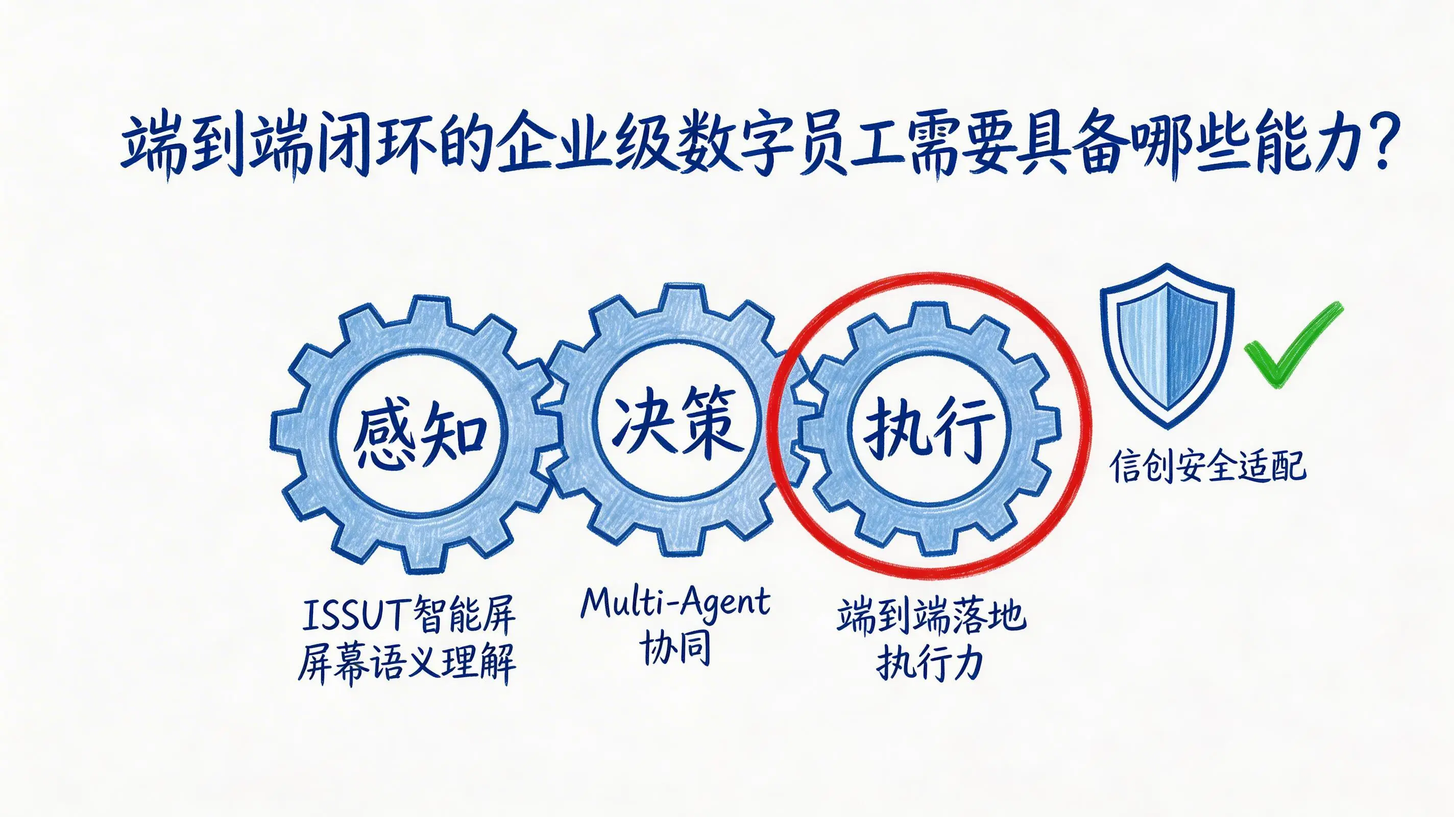 总而言之,端到端闭环的企业级数字员工,已经超越了传统AI助理的范畴,进化成为新时代的“高级数字员工”。它凭借前沿的屏幕理解技术打通了执行的“最后一公里”,利用大模型加持解决了“如何思考”的问题,并以坚如磐石的信创安全为底座,最终实现了从指令下达到结果交付的完整价值闭环。