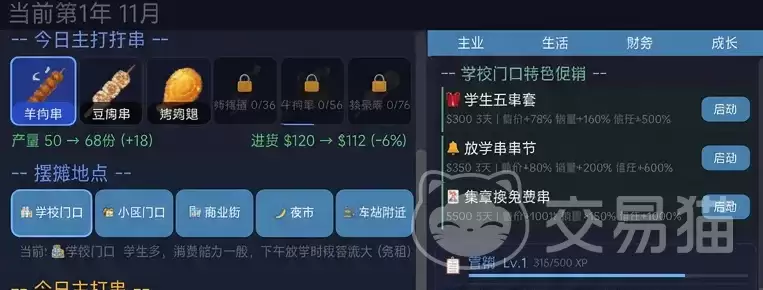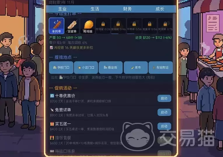 生意的成败,往往在选址那一刻就埋下了伏笔。这款游戏提供了高自由度的选址机制——是选人流如织的车站出口,还是消费力旺盛的大学城周边?是押宝步行街的转角黄金位,还是扎根夜市的主干道?不同的地段,客流量、顾客构成乃至消费偏好都截然不同。选好了位置,接下来就得在营销上动脑筋了。游戏支持玩家自定义促销策略,无论是限时折扣吸引人气,还是“满赠烤蔬菜”、“第二串半价”这类提升客单价的组合拳,都能有效刺激消费,让每日的营收数字更加好看。